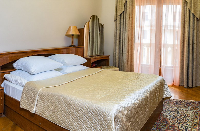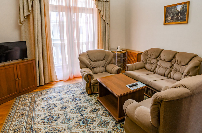 Площадь номера - 62 кв.м. 2 осн. места. 1 доп. место. Балкон. Мебель: вешалка, диван, зеркало, кресло, кровать двуспальная, прикроватные тумбочки, стол, стулья, шкаф. Оборудование: гладильная доска, кондиционер, мини-холодильник, набор посуды, телевизор, утюг, электрочайник. Санузел: с ванной, тапочки, туалетные принадлежности, фен, халат. Сервис: Wi-Fi бесплатно, смена полотенец (1 раз в 7 дней или по просьбе), смена постельного белья (1 раз в 7 дней или по просьбе), уборка номера (ежедневно).